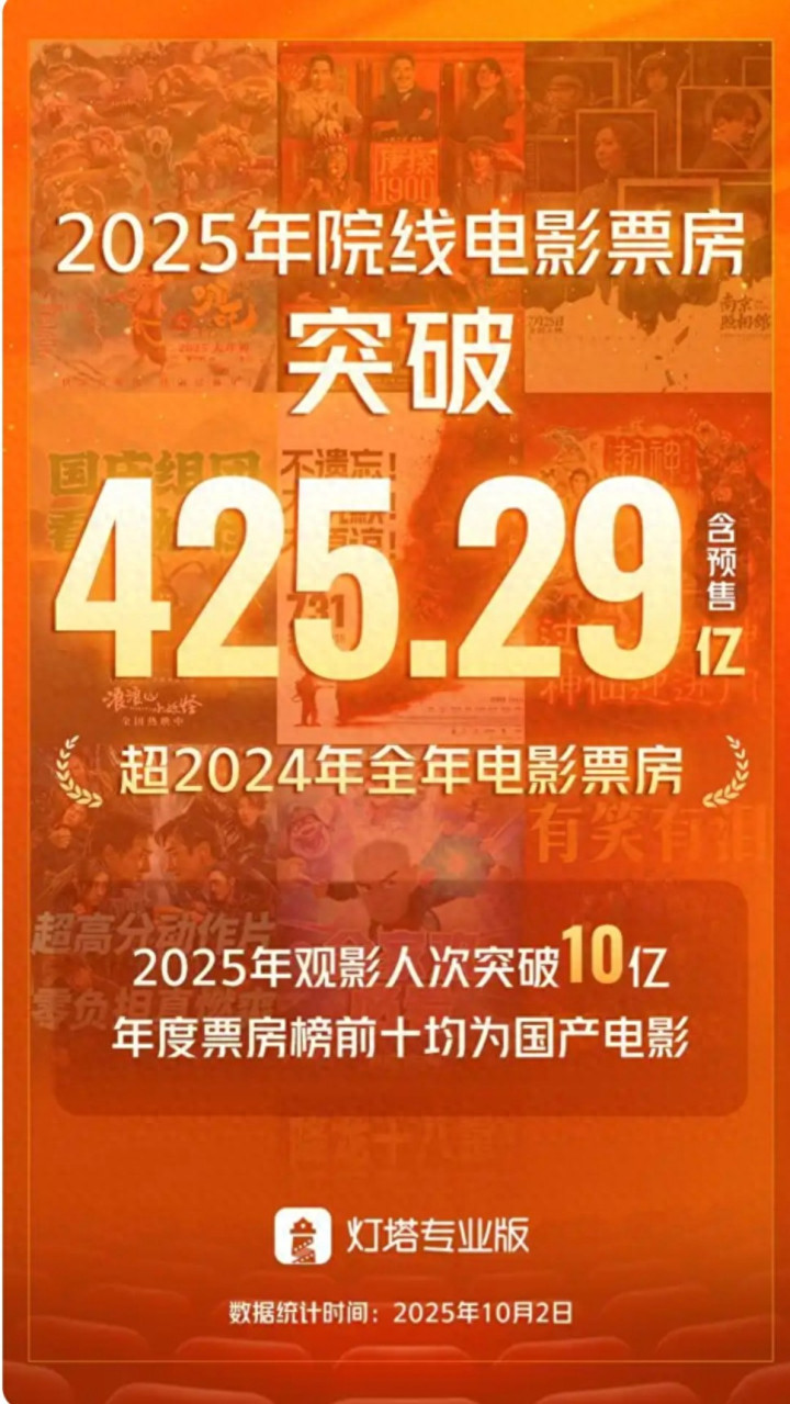 截至10月2日14时16分,2025年度总票房(含预售)已突破425.022亿元,超过2024年全年电影票房成绩。这一里程碑的提前达成,标志着中国电影市场在2025年实现了强劲复苏。